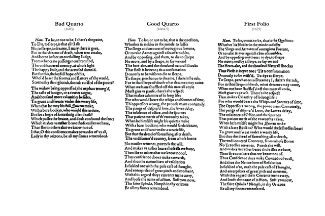 The earliest texts of William Shakespeare 's works were published during the 16th and 17th centuries in quarto or folio format. Folios are large, tall volumes; quartos are smaller, roughly half the size. The publications of the latter are usually abbreviated to Q1, Q2, etc., where the letter stands for "quarto" and the number for the first, second, or third edition published.